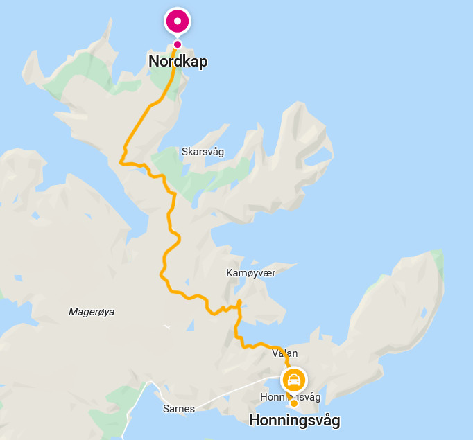 Die beste Verbindung ohne eigenem PKW von Honningsvåg nach Nordkap geht per Bus, dauert 40-45 Min. und kostet ca. kr 350, ca. € 50,00. Eintrittspreis zum Nordkap-Museum und der angrenzenden Kirche sind ca. kr 350, ca. € 50,00. Der Zugang vom Busparkplatz zum Globus ist kostenlos, was ungern kommuniziert wird!