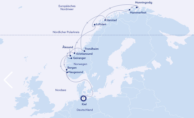 An Bord der VASCO DA GAMA nehmen Sie von Kiel aus Kurs auf die nördlichste Spitze des europäischen Kontinents. Sie werfen vom berühmten Berg Fløyen aus einen ausgiebigen Blick auf die Stadt Bergen mit ihrem traditionellen Händlerviertel und dem Fischmarkt. Sie überqueren den Polarkreis und besuchen die Lofoten, die teilweise mehr als 1.000 Meter hoch aus dem Meer ragen. Am Nordkap angekommen, wartet – abhängig von Ihrer Reisezeit – ein spektakuläres Once-in-a-Lifetime-Erlebnis auf Sie: die Mitternachtssonne!