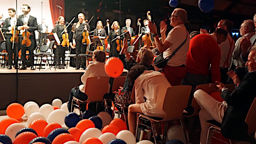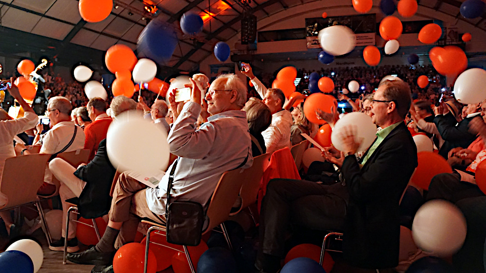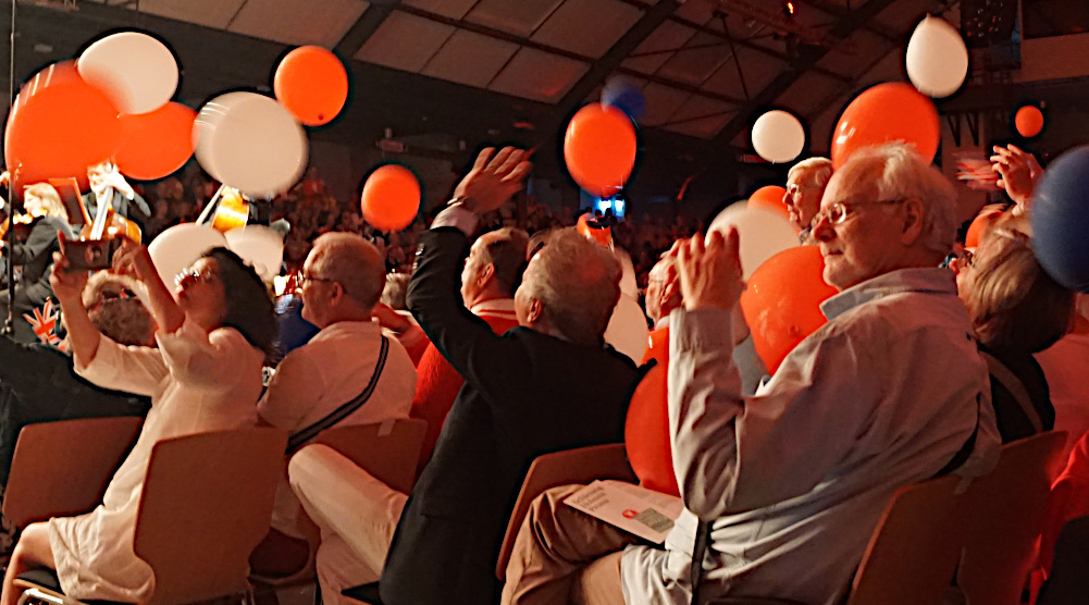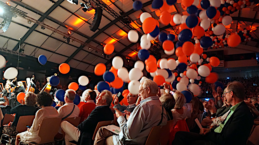 Zu dessen absehbarem Ende wurden die in Netzen unter der Hallendecke hängenden Luftballone in den Schleswigholsteinfarben und den Britischen der Schwerkraft übergeben…