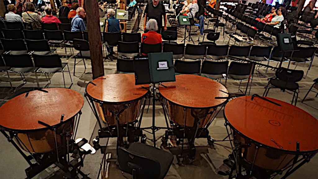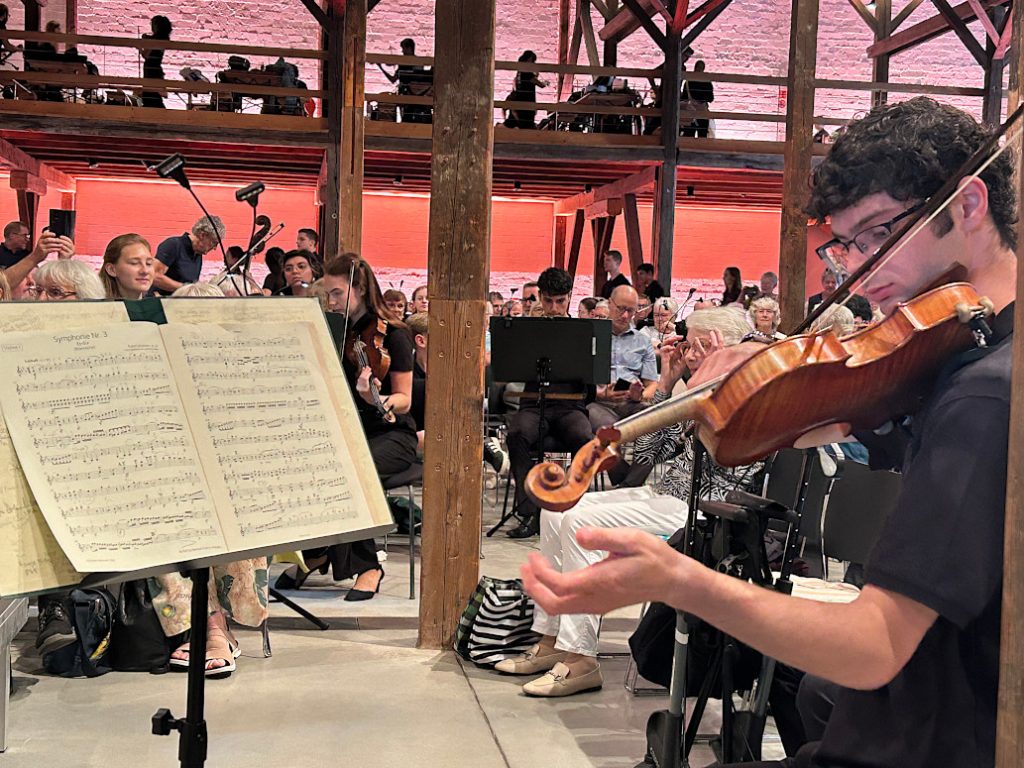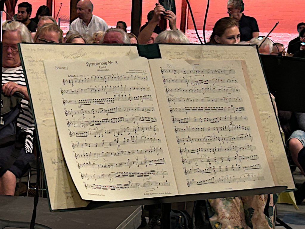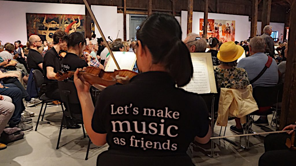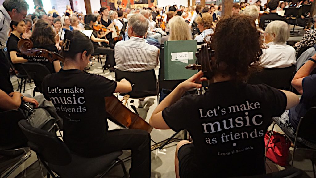 und zwar rund um das Dirigentenpult herum und in der ganzen Thormannhalle verteilt. Jeder durfte sich hinsetzen, wo er wollte – konnte z.B. der japanischen Geigerin über die Schulter gucken oder sich vom argentinischen Trompeter in den Nacken blasen lassen.