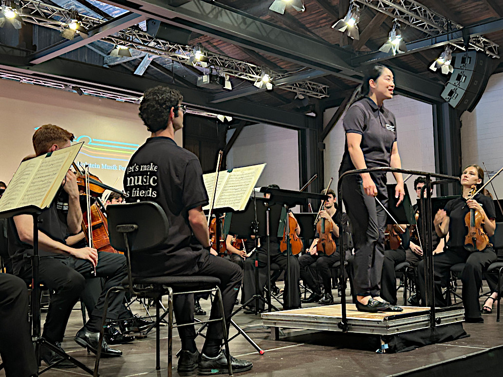Charismatisch und dem Publikum zugeneigt, so erlebte man das Festivalorchester Schleswig-Holstein Konzert K 51 am Samstag, den 19 Juli 2025 um 11:00 Uhr in Rendsburg Büdelsdorf, in der ACO Thormannhalle : ZOOM mit der Drigentin Holly Choe.